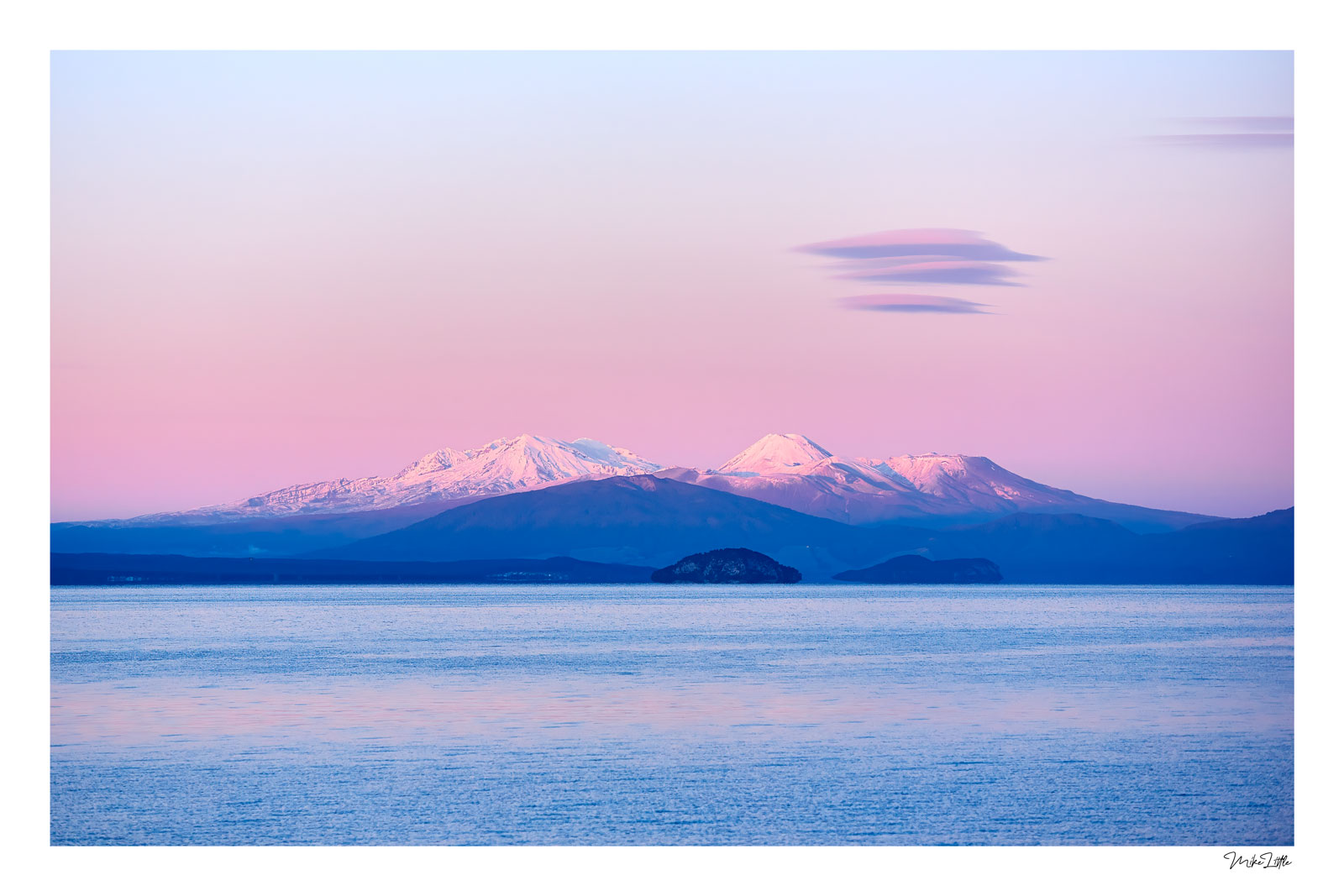 Shot this on a very cold winter morning (-4 degrees at the time) at Wharewaka Point, Lake Taupō. Mt Ruapehu, Ngauruhoe & Tongariro appear in the background. The clouds above the mountains are Altocumulus Lenticularis or wave clouds (see http://blog.metservice.com/Turbulence).